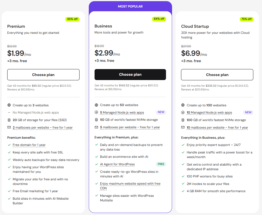 Hostinger openly shows that its lower intro price is promotional and that renewal pricing is higher. That transparency helps, but it also means you should judge Hostinger on the second bill, not just the first one.